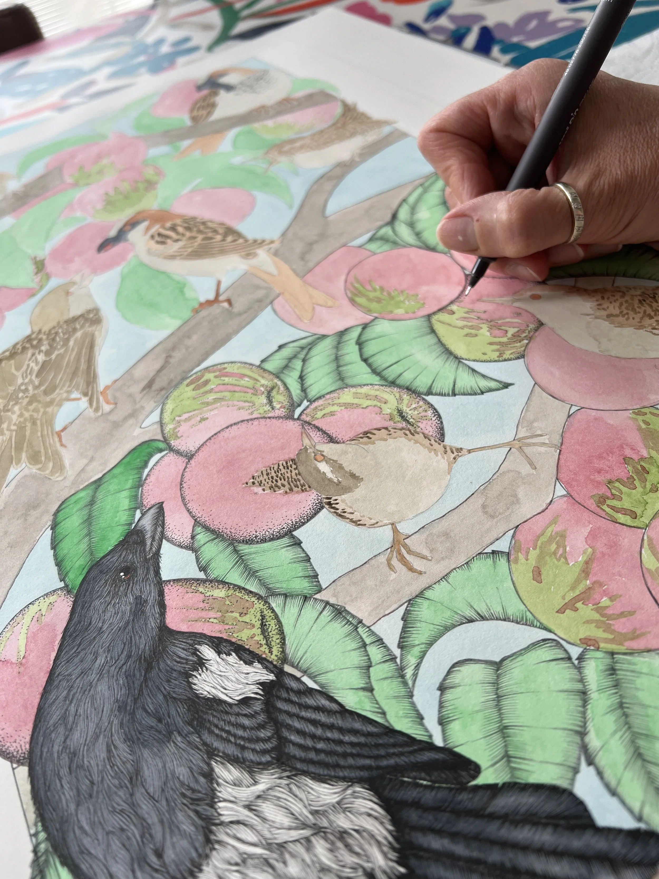 I want each of the four panels to be individual but also ‘fit’ together as a series. For ‘Summer’ I kept the same format of a ‘snapshot’ of a tree with the movement and interaction of birds to maintain a consistency. To make it individual I changed the species of birds, this time including a single watchful magpie, several busy Wrens and a couple of perching House Sparrows. As with ‘Spring’, I allowed the tree to reflect the season, this time with apples grown from the apple blossom from the first panel. I plan on continuing this theme with the ‘Autumn’ and ‘Winter’ panels.