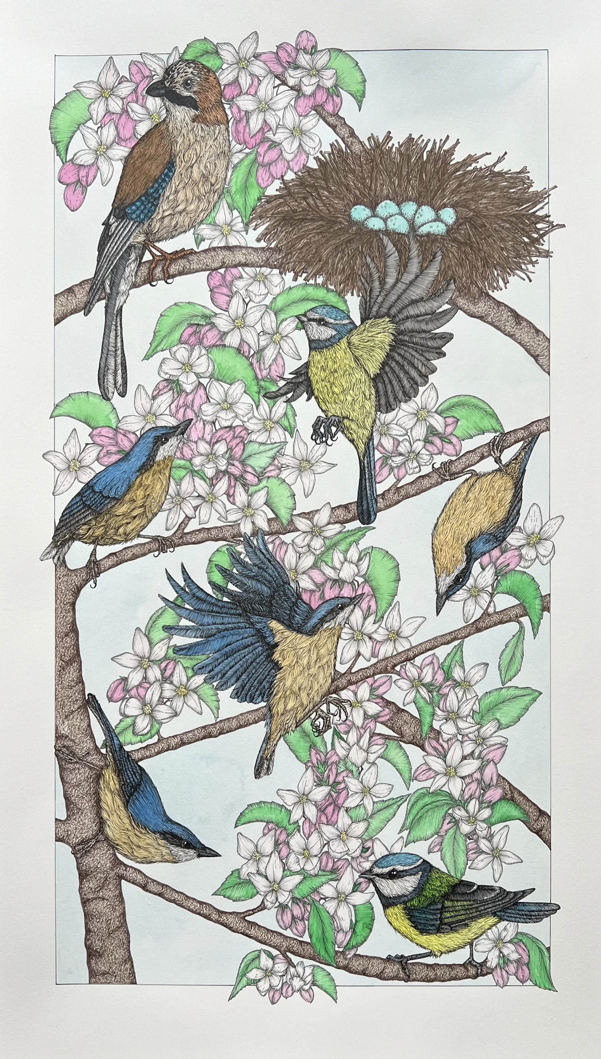 The first season I decided to depict was ‘Spring’ (title yet to be decided!) in my usual watercolour wash and pen detail style. A snapshot of a tree busy with life during this hopeful season, I wanted to capture the inquisitiveness of the Nuthatch, the quietness of blue tits and a watchful Jay guarding its nest with an apple blossom background. I thoroughly enjoyed becoming lost in this piece, so much so as soon as it was finished I started planning the next panel for ‘Summer’.