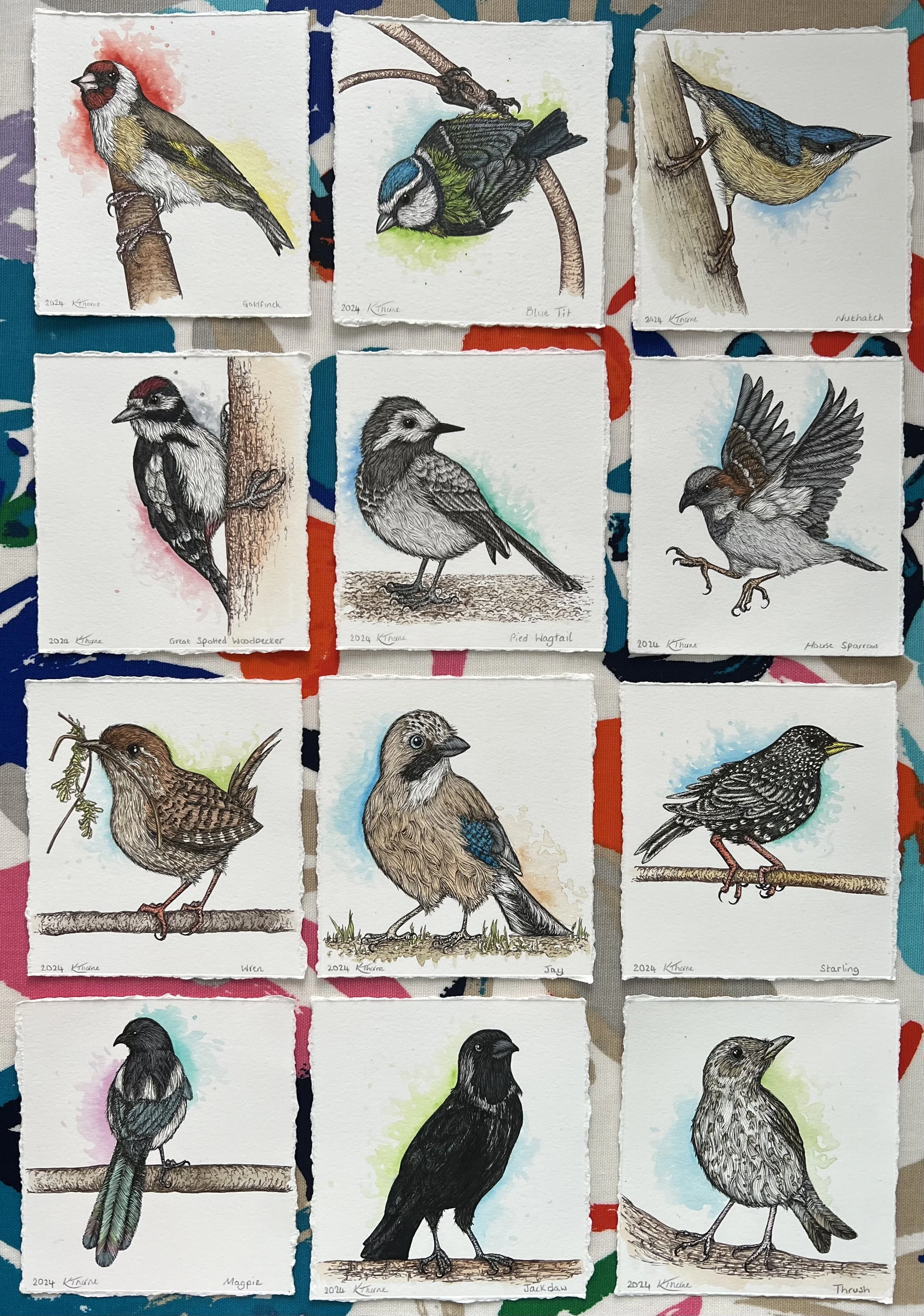 I went back to drawing the animals that I love to draw and the ideas started flowing! I decided to create a new series of work based on British birds and started by developing a series of twelve mini pieces on 11cm x 12cm pieces of watercolour block .