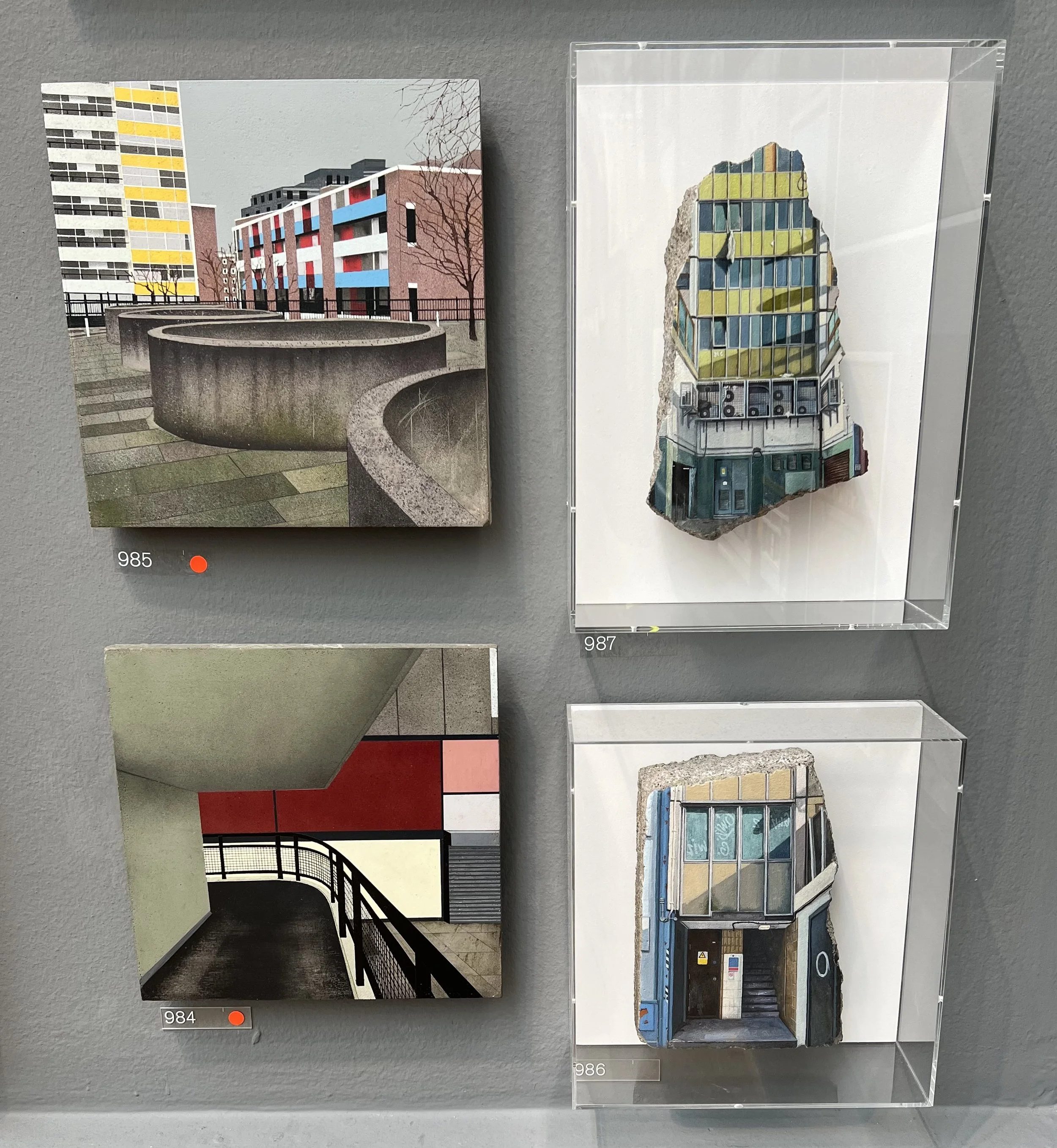 The artist of these pieces painted buildings beautifully on pieces of concrete. I don’t know if the concrete was actually from the buildings they painted as again there was no information, but I would like to think they were. They were encased in Perspex boxes almost like precious museum exhibits to preserve what once was. And I thought it ‘worked’!