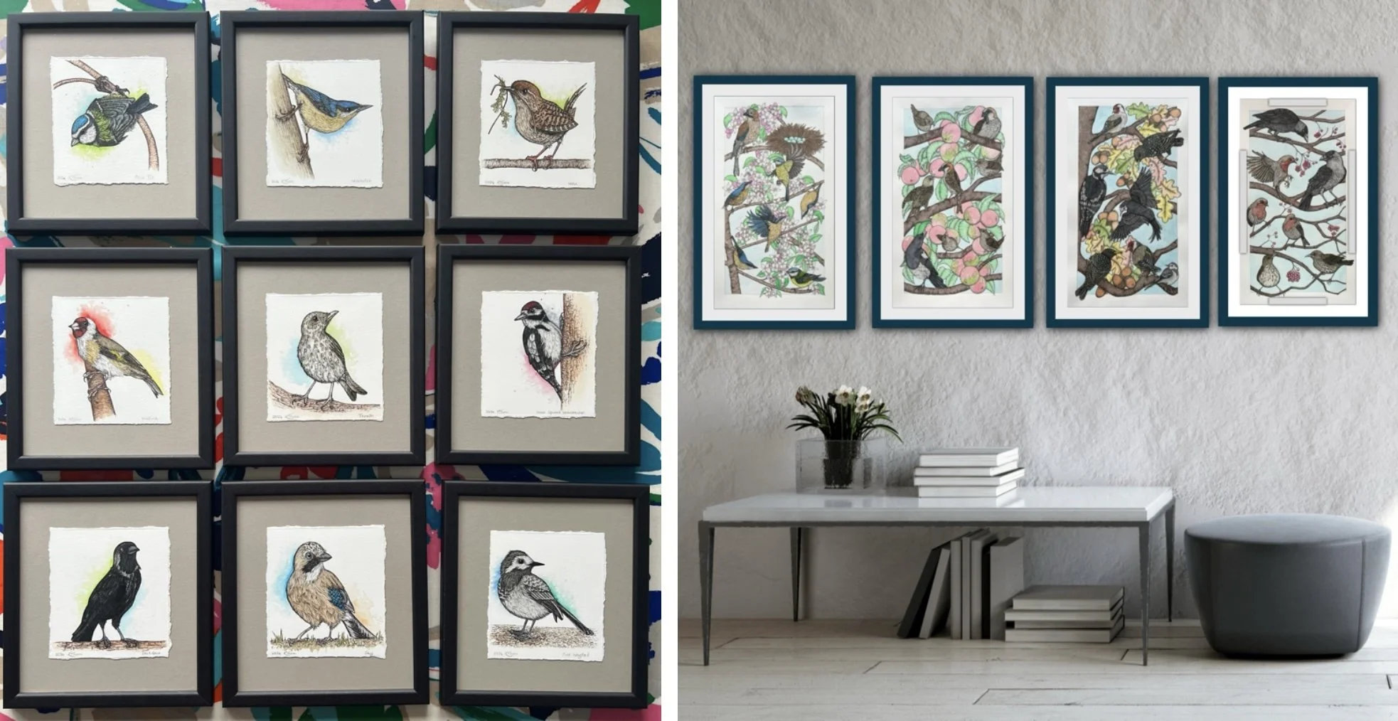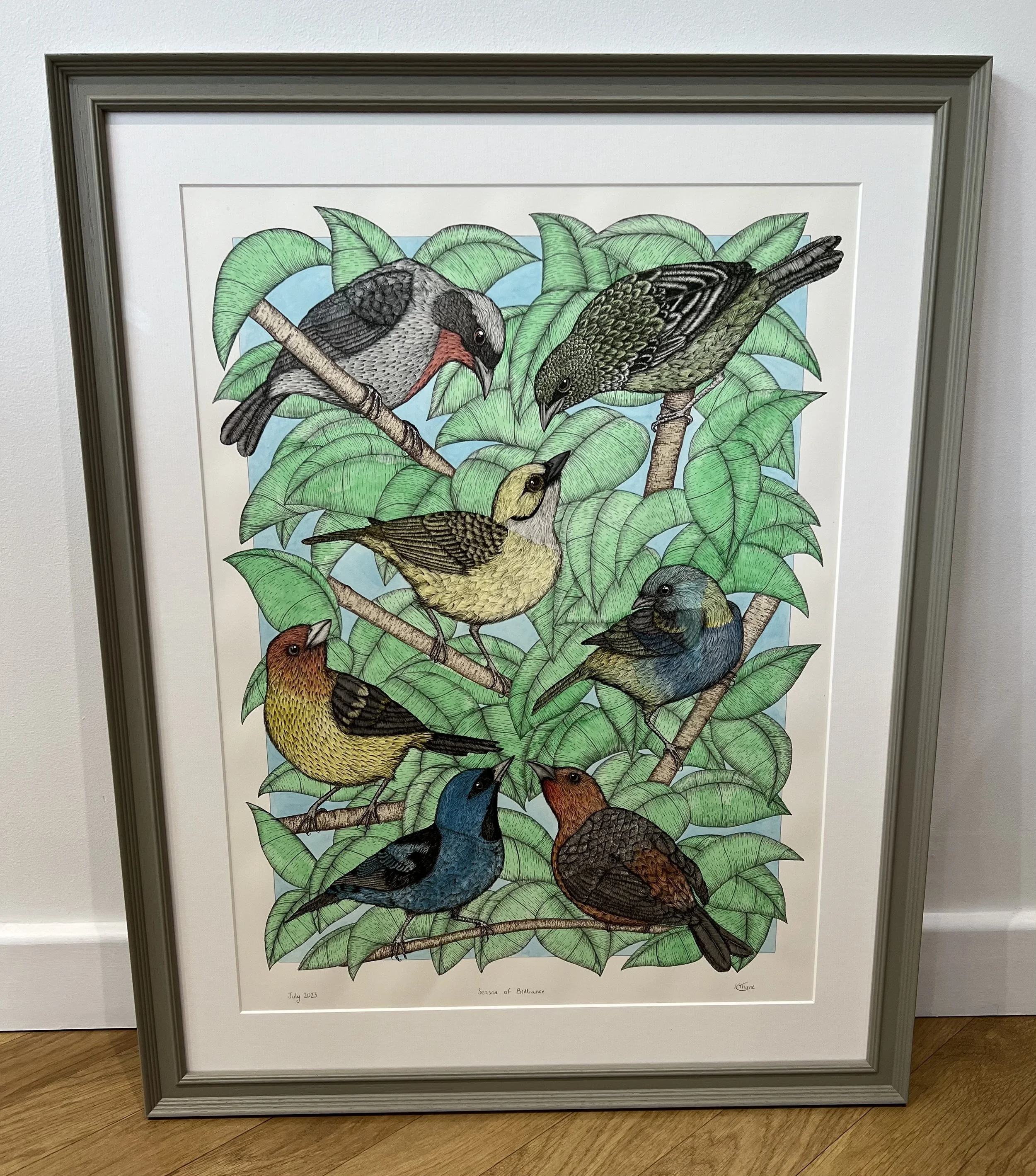 I loved creating the Hummingbird and Tanager series and whilst working on these pieces I used to watch the British birds in my garden and always wondered how aware they were of each other and whether they interacted when in the trees and humans weren’t watching. This led to the British bird minis and the four large pieces depicting British birds during each season. Several minis sold and I received a lot of interest and lovely comments at Art:Surrey in the autumn, and from the feedback I have decided to sell the seasons pieces together as a set rather than individually; they do belong together!