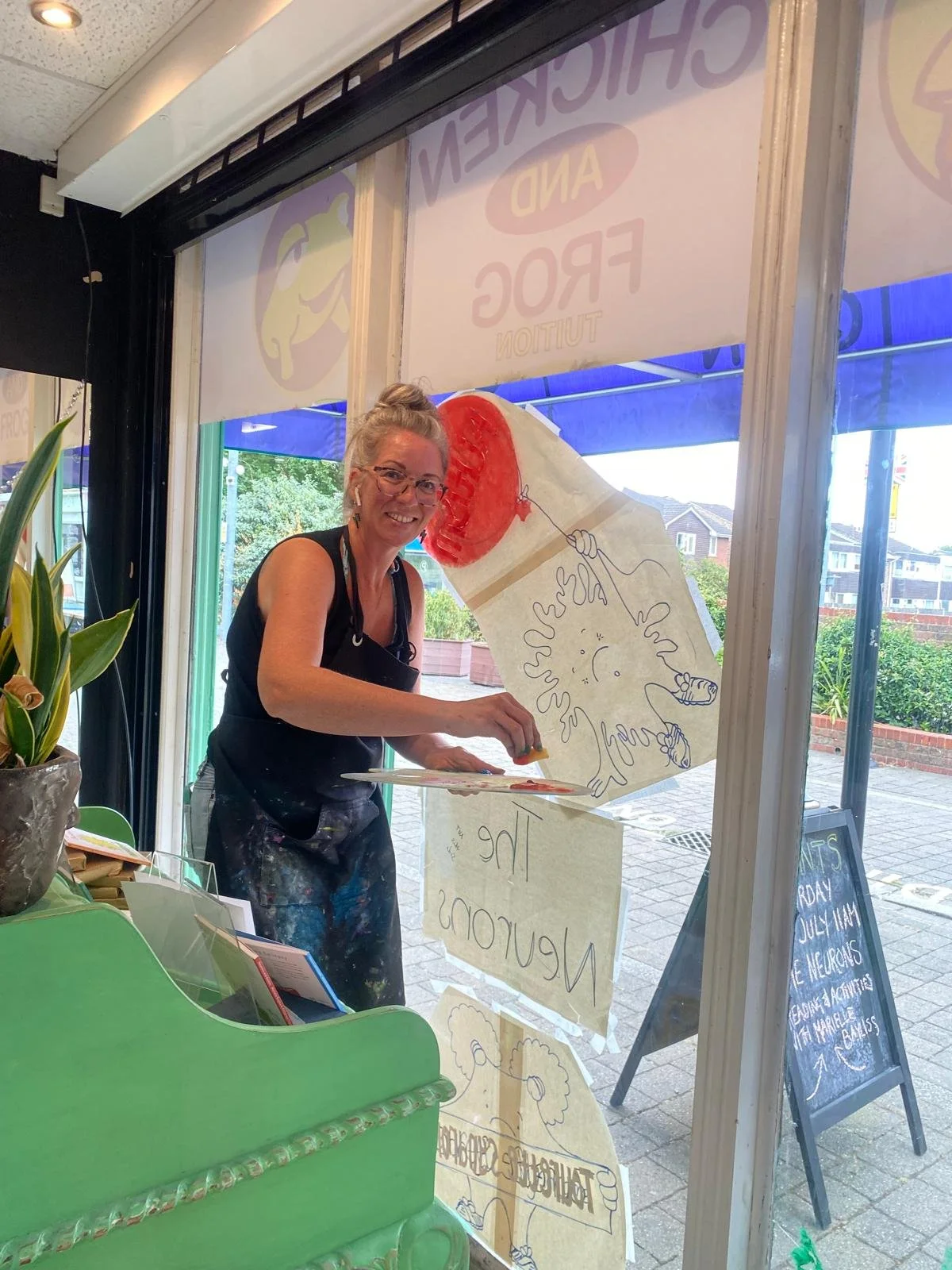 Life continues to be a balance and lots of fun, with so much going on behind the scenes. The main focus recently has been painting the window at the Chicken and Frog Bookshop in Brentwood for The Neuron Series. Marielle Bayliss, the author, made contact with Natasha the owner of the bookshop a few months ago and we popped in a date for a workshop and the window painting. I have never done anything like this before and to be honest I didn’t have a clue what I was doing. So, I did what most people do and asked good ol’ Google!
