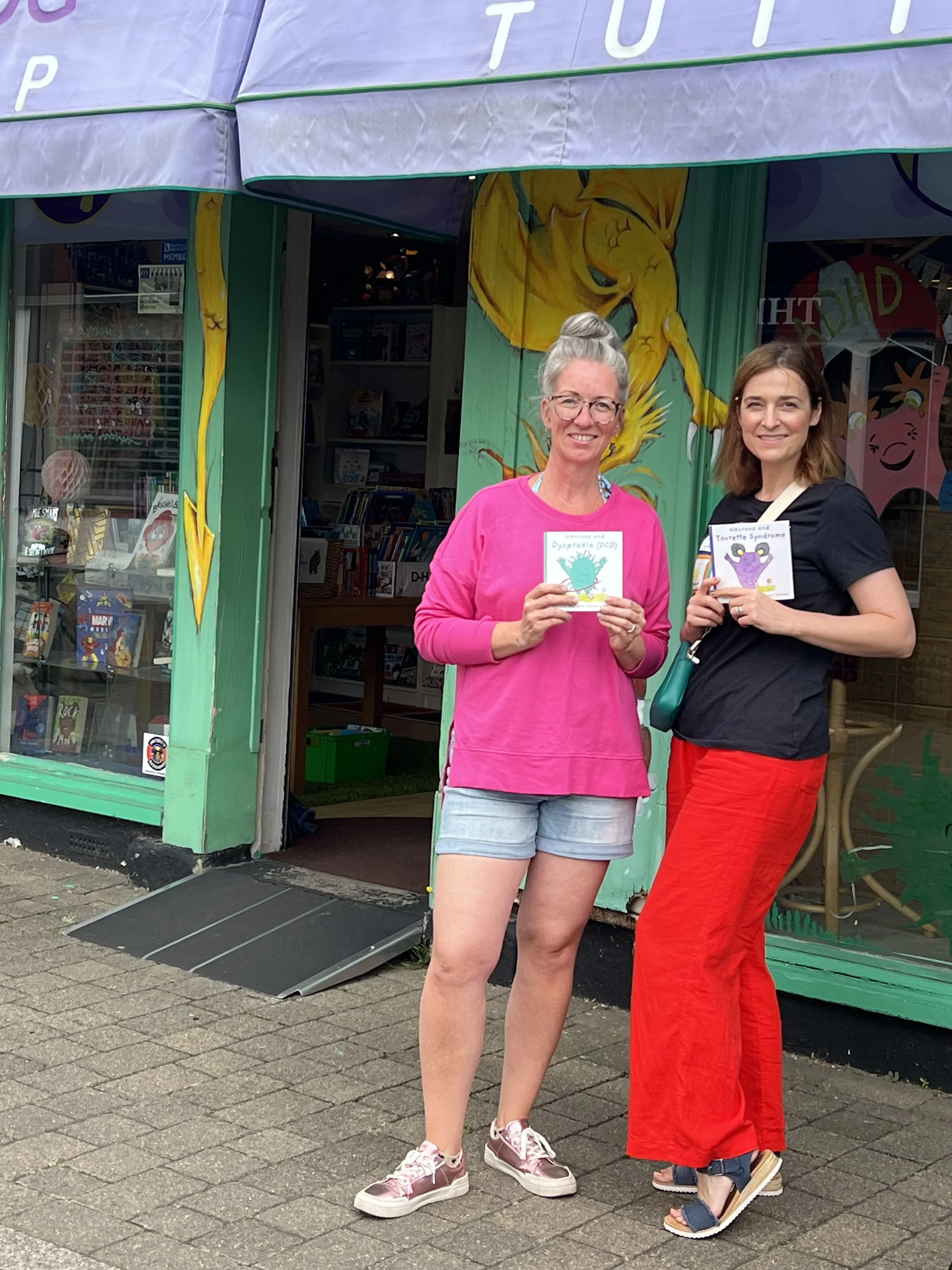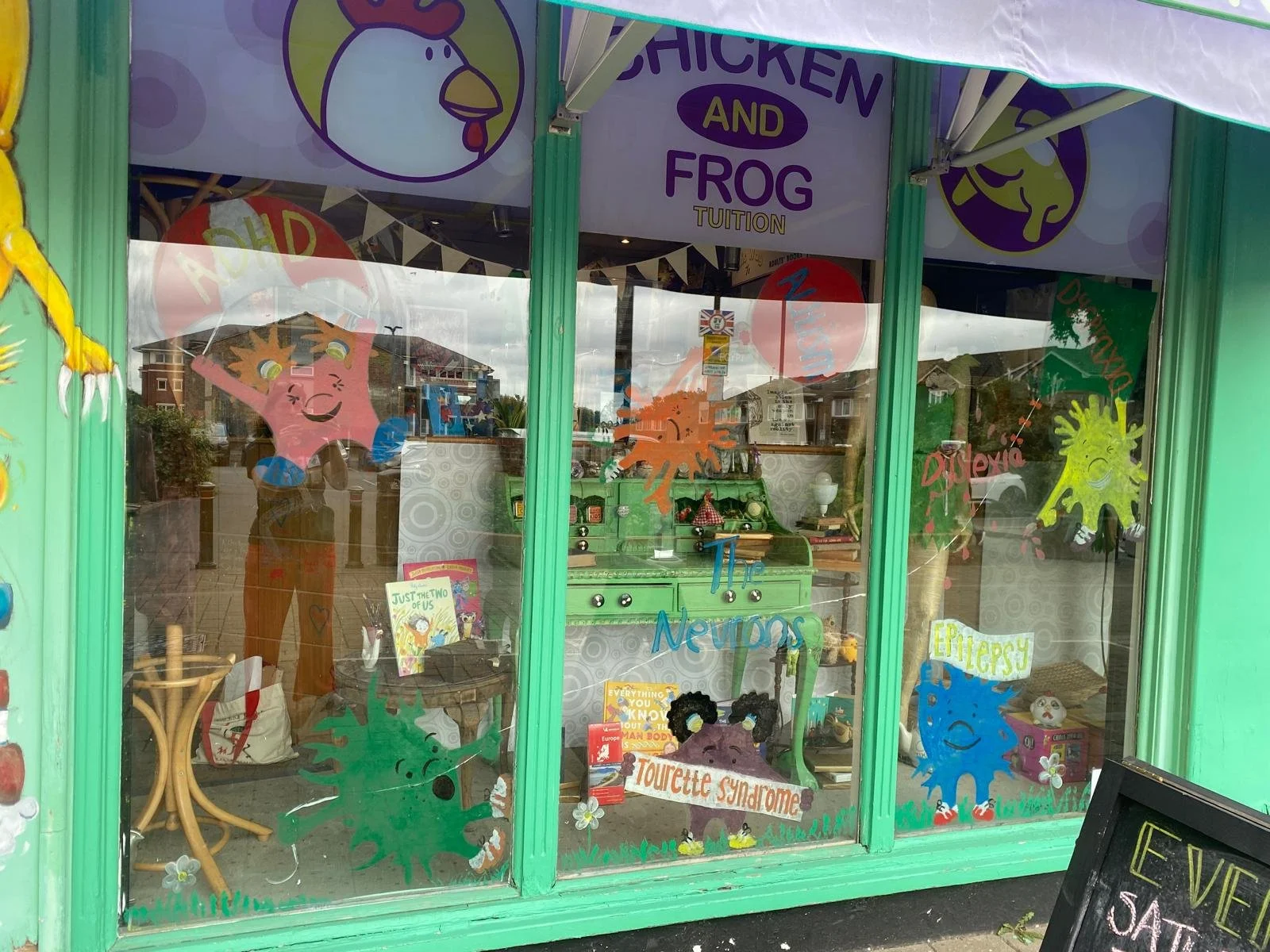 It took me two hours to get to the Chicken and Frog Bookshop so I wanted to make sure I was able to complete the windows in a day; it was my first painting and three big windows so I needed to be ‘on it’! The bookshop itself is a hub of the community; it has such a great book selection with a neurodiversity room and a separate room for classes. Natasha, the owner, is so passionate about the importance of reading and understanding neurodiversity it was inspiring. The Neuron Series fitted in so well there and it was a pinch me moment seeing them all on the shelves.
