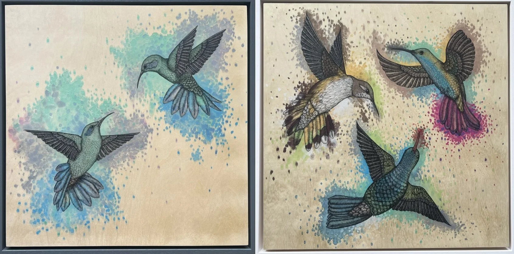 ‘A Season and a Charm’ (right); a group of Hummingbirds is called a Charm and a group of Tanagers a Season’, still has a sense of movement and connection between the birds, and I loved becoming lost in the detail of the birds, foliage and flowers