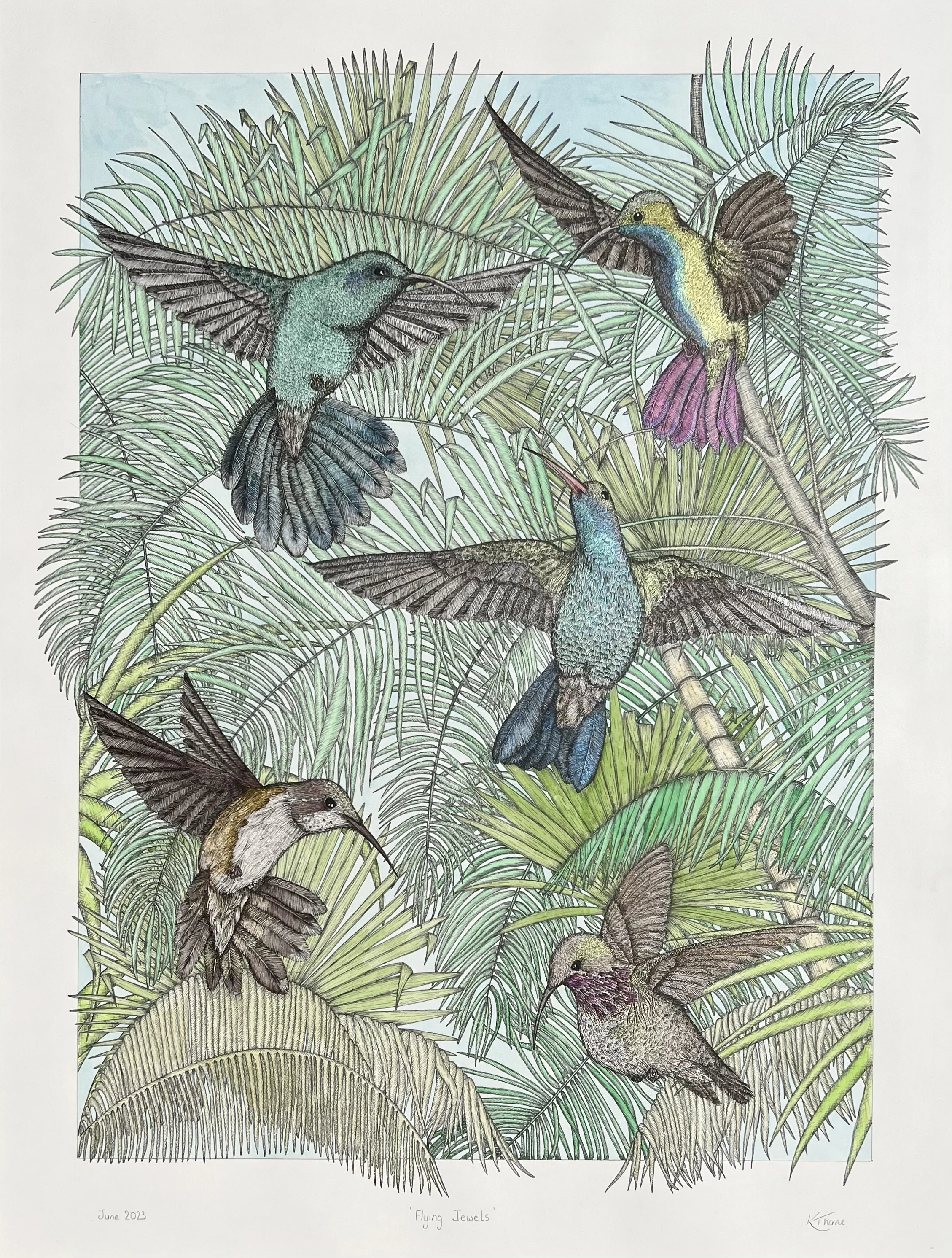For April’s blog I thought I would chat about what I found, and continue to find interesting, intriguing and inspirational about Hummingbirds and Tanagers. I painted and drew them many times last year and this resulted in a series of work which I feel pretty proud of. This weekend I dropped the three biggies off at the framers where they will be displayed in a beautiful frame with non reflective glass ready for the Landmark Spring Fair in May. I cannot wait to collect them!