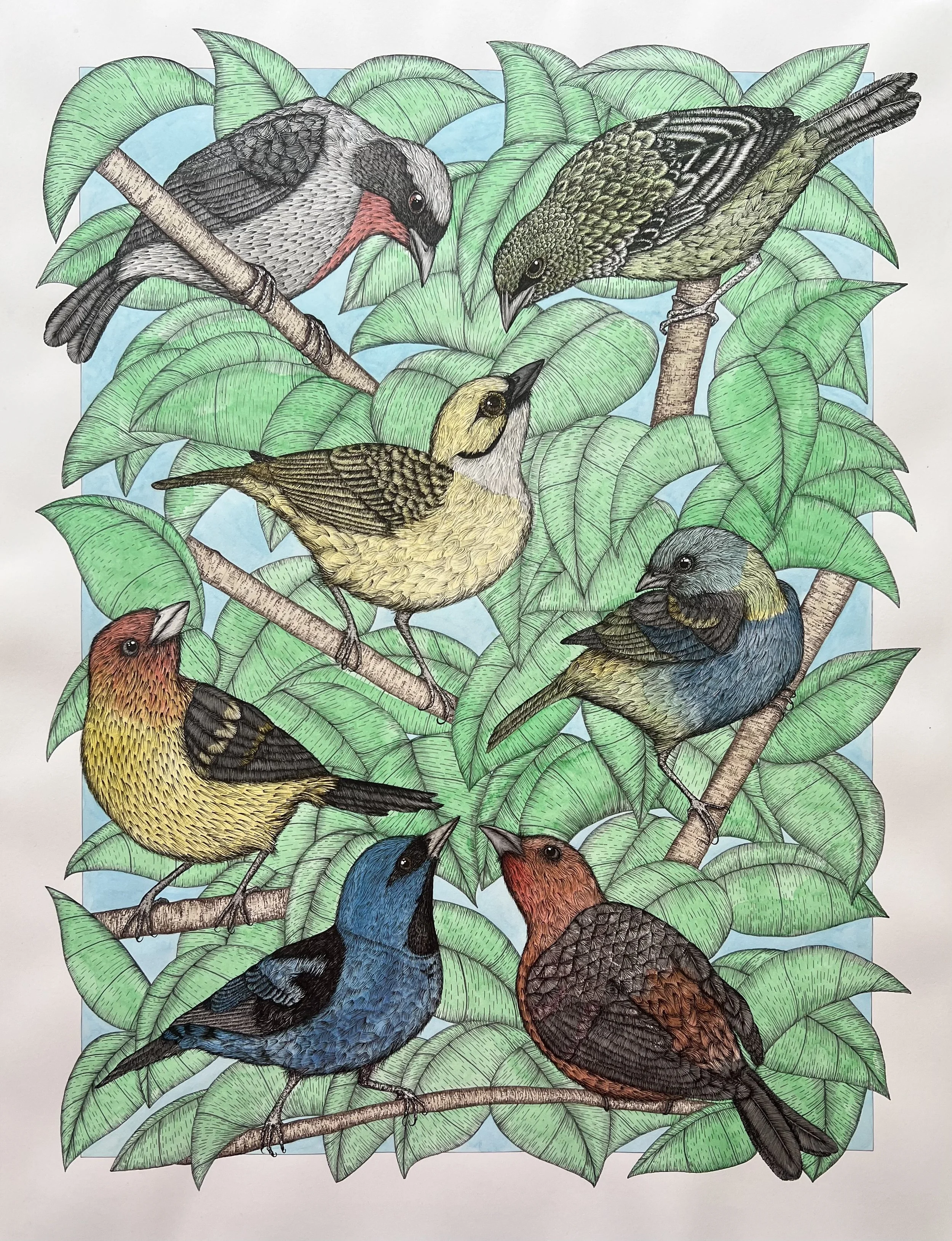 I enjoyed creating ‘Flying Jewels’ so much I decided to work on another piece, this time adding Tanagers to the group. I wanted to the Tanagers to watch the Hummingbirds flying up out of the foliage. In this piece I varied the type of leaves and added flowers to soften and create layers of depth.