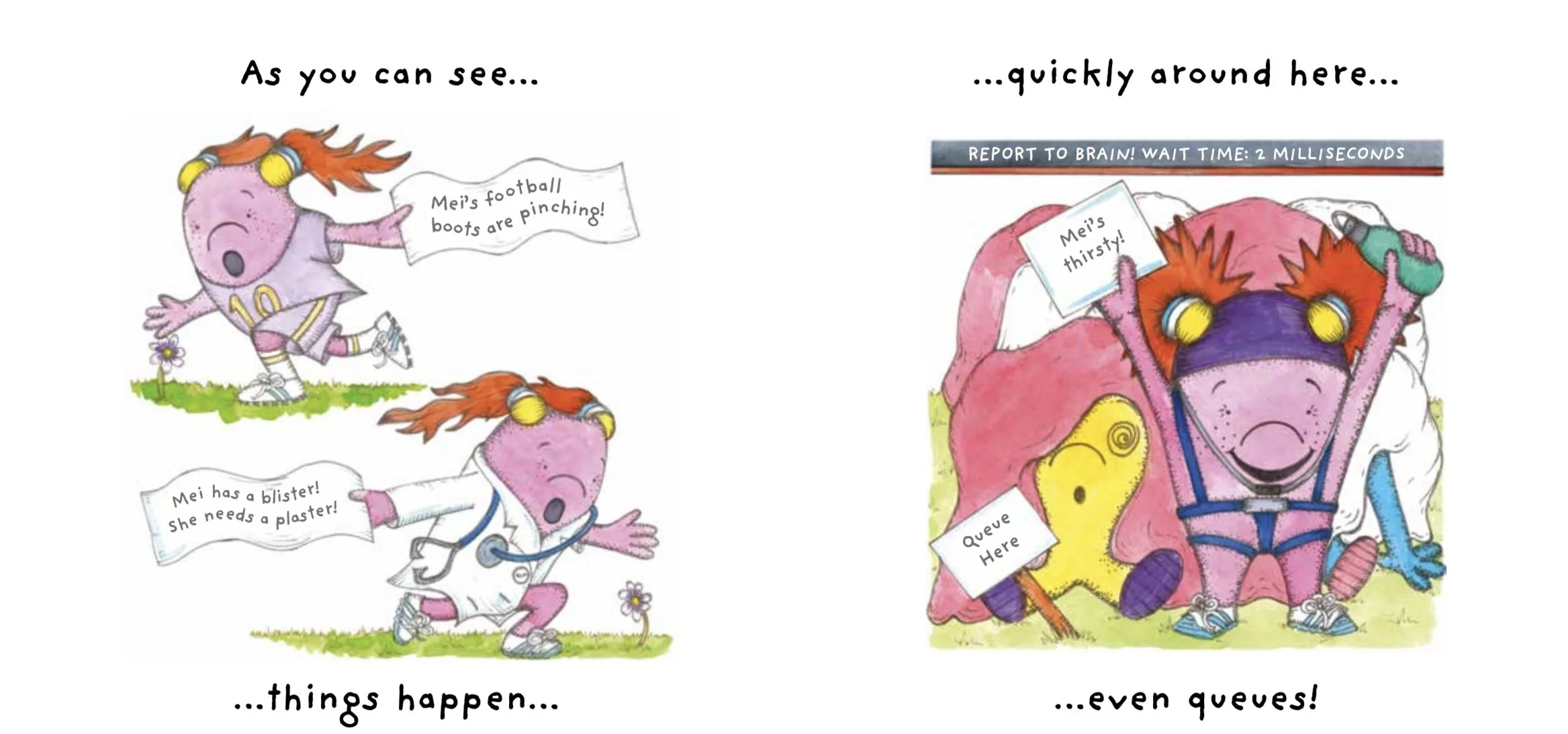 Meet Fizz the neuron! Fizz helps your brain to keep up to date with everything that happens in your body, from feeling cold to feeling itchy. She’ll bungee jump down your spinal cord to send speedy messages to and from your brain. But sometimes these messages can be lost or delayed in someone with ADHD.